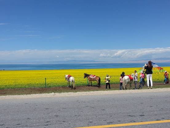 美麗的青海湖熱情歡迎遠道的客人,一片黃色的花海映照碧藍的高原明珠。楊寶民教授、宋恒明副總經(jīng)理眺望爭相綻放的一望無際的油菜花。