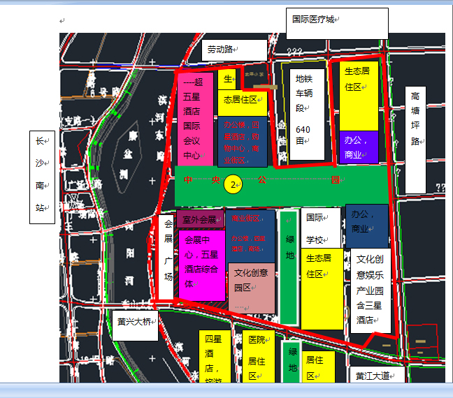 根據(jù)長(zhǎng)沙實(shí)際情況,提出了4804畝和4100畝土地的不同位置方案進(jìn)行比較,對(duì)不同方案的土地功能進(jìn)行明確分區(qū),突出會(huì)展、金融和文化創(chuàng)意以及電腦軟件作為現(xiàn)代服務(wù)業(yè)發(fā)展的重點(diǎn)。