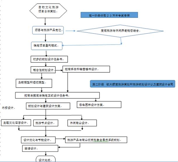 設(shè)計(jì)經(jīng)費(fèi)不能小于5000萬元,沒有一流的團(tuán)隊(duì)就沒有一流的文化創(chuàng)意。作者提出全新的文化旅游項(xiàng)目工作流程如下: