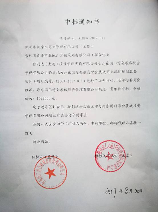 8月26日深圳市新摩爾商業(yè)管理有限公司聯(lián)合吉林省盛澤公司中標鴨綠江畔會展旅游城項目,中標金額為109.7萬元。